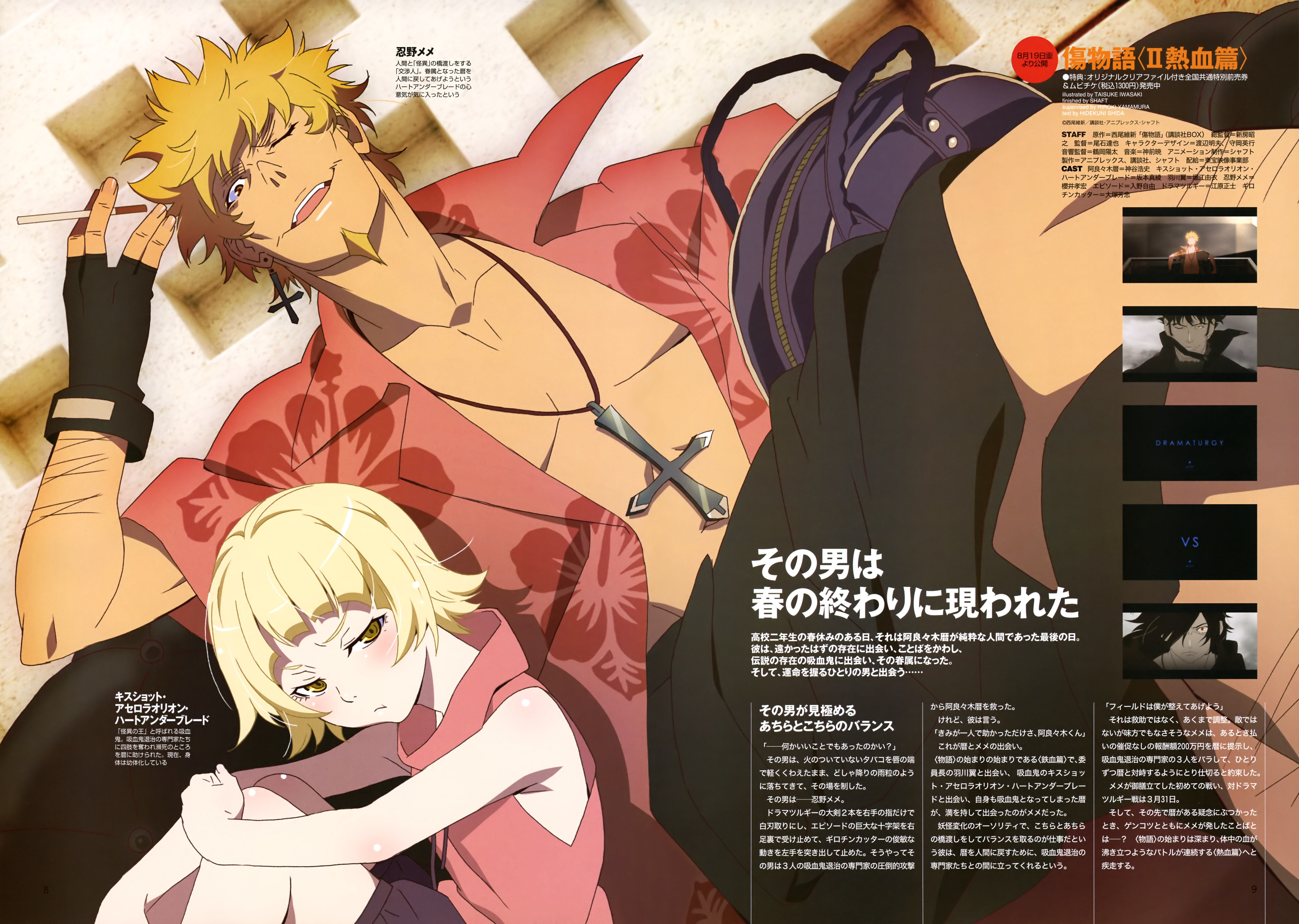 Awaiting him are three powerful vampire hunters—Dramaturgy, a giant vampire hunter who is a vampire himself. Episode, a half-vampire who wields an enormous cross, and Guillotine Cutter, a quiet man who specializes in killing vampires. Will Araragi be able to take back Kiss-shot's limbs from the vampire hunters? Amidst the soft spring rain, the curtain rises on this fateful blood bath...